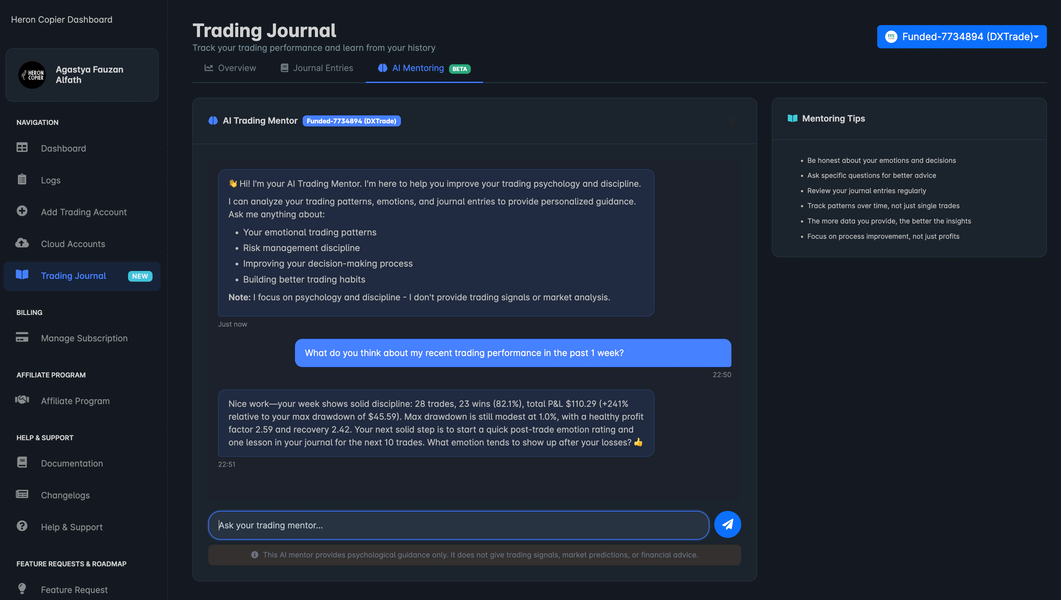 Hey everyone! 👋We just shipped something new that we’ve been working on: AI Mentoring is now live in the Trading Journal (currently in BETA).Think of it as your personal trading coach that actually knows your trading history. It looks at your trades, journal entries, emotions, and ratings to give you feedback that’s specific to you.This AI focuses on trading psychology and discipline, not market analysis or signals. It won’t tell you when to buy or sell. Instead, it helps you understand your own patterns and become a more consistent trader. 🚀What it can help with: